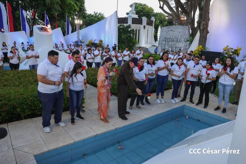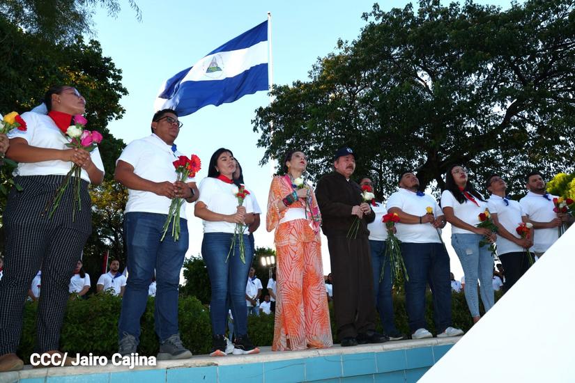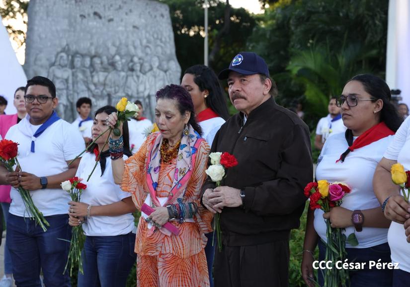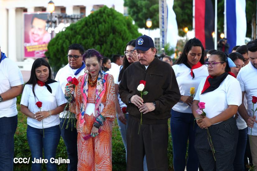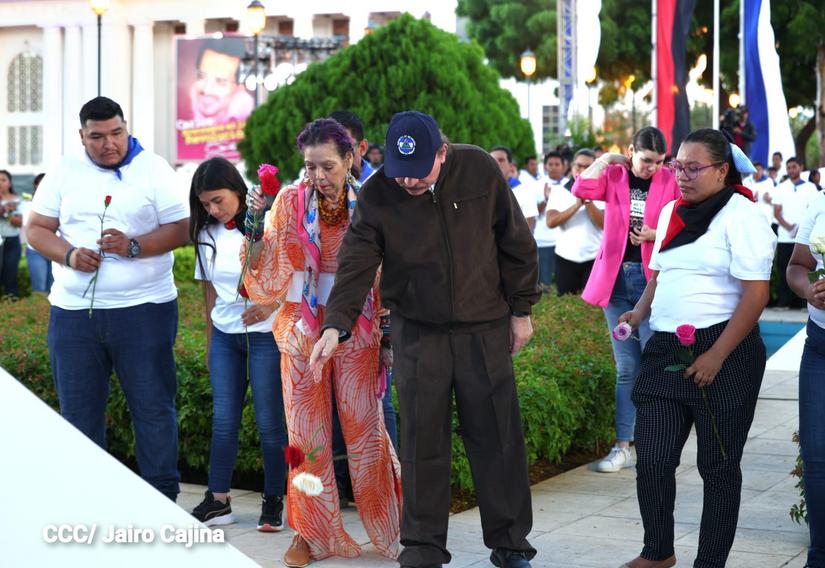 (El 19 Digital).- El comandante Daniel Ortega, junto a la Compañera Rosario Murillo, depositaron flores en el mausoleo del Comandante Carlos Fonseca Amador, luego se dirigió con los miembros de la Juventud Sandinista 19 de Julio al mausoleo del Comandante Tomás Borge y dijo “Viva Tomás”. Y luego donde el eslabón vital entre el General Augusto C. Sandino, al mausoleo del Coronel Santos López.