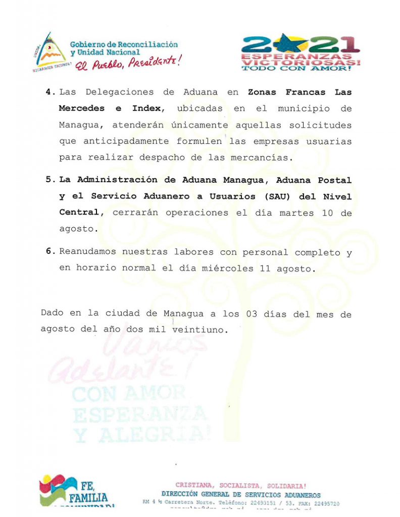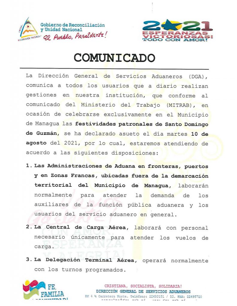 La Dirección General de Servicios Aduaneros (DGA) informa a todos sus usuarios que el próximo 10 de agosto estarán atendiendo de acuerdo a las siguientes disposiciones.