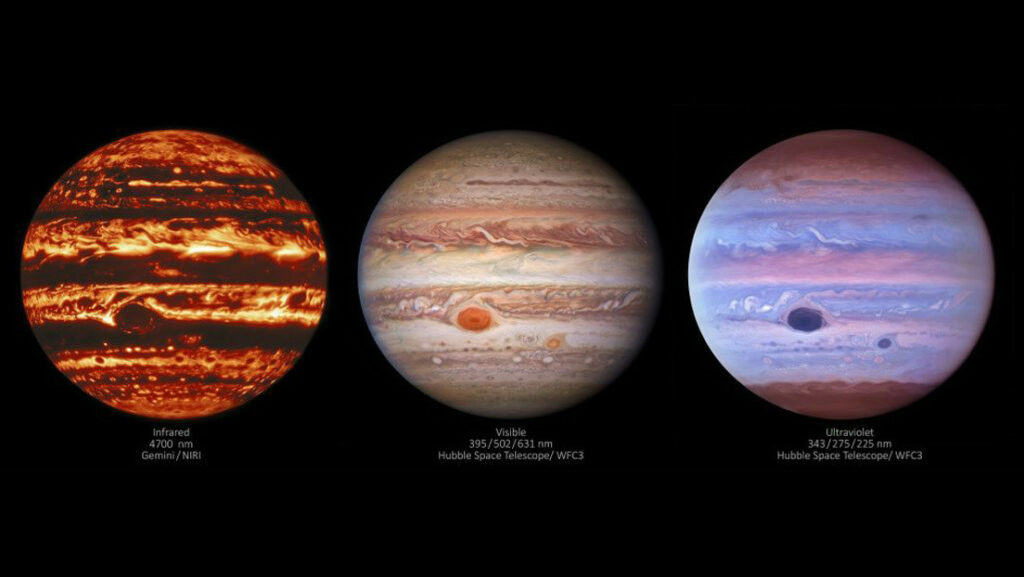 La observación de objetos astronómicos en diferentes longitudes de onda de luz permite a los científicos obtener información que de otro modo no estaría disponible y, como era de esperar, Júpiter tiene un aspecto muy diferente en las tres imágenes. Sin embargo, los investigadores notaron algo aún más intrigante al fijarse en la Gran Mancha Roja del planeta, el famoso sistema de tormentas persistentes lo suficientemente grande como para tragarse la Tierra entera.