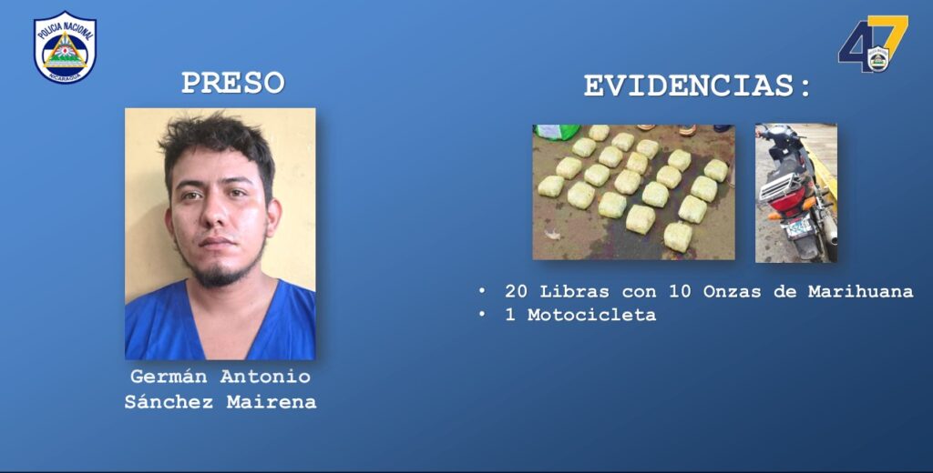 “La Policía Nacional perfiló la motocicleta placa CH 52460, conducida por el sujeto German Antonio Sánchez Mairena, de 25 años de edad. En la requisa se le encontró una caja con 20 paquetes rectangulares con hierba color verde. La prueba de campo dio positivo a marihuana con un peso de 20 libras con 10 onzas.