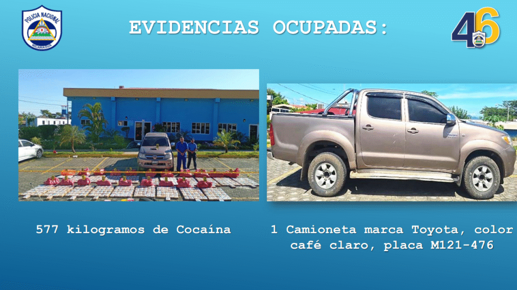 “Como resultado de la Estrategia Plan de Muro de Contención contra el Crimen Organizado y Tráfico y Narcotráfico Internacional, el día jueves 23 de octubre del año 2025, a las 4 de la mañana en vía pública del empalme de San Francisco Libre, 10 kilómetros al Oeste, la Policía Nacional perfiló camioneta marca Toyota color café claro, placa M 121-476”, comunicó este lunes la Cojefa de la Policía Nacional, subcomisionada Karen Obando.