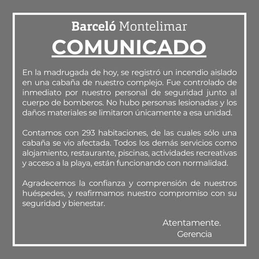 A continuación el comunicado íntegro del Hotel Barceló Montelimar.