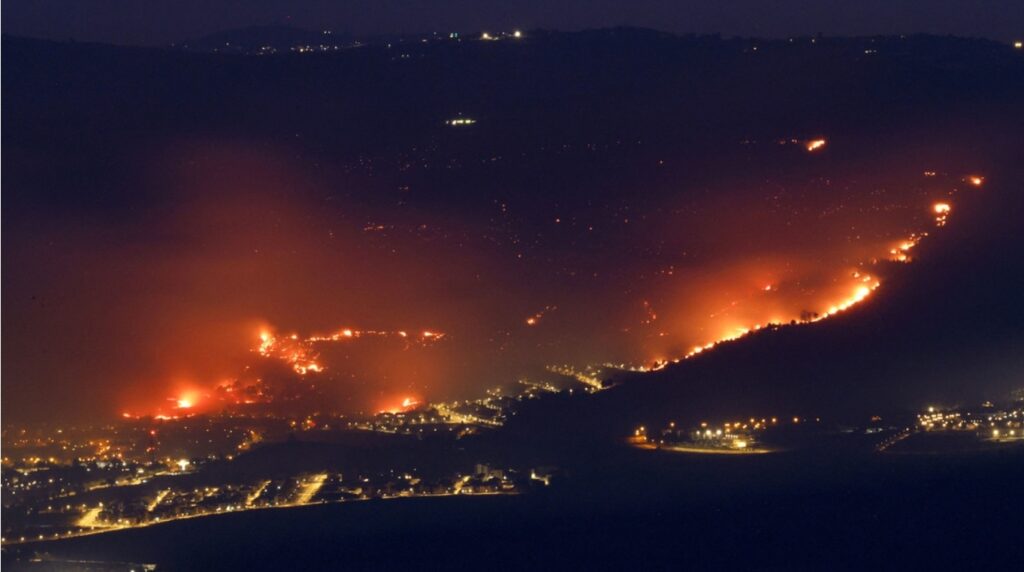 Fuertes incendios arrasan varias localidades en el norte de Israel, luego de los ataques con cohetes y drones efectuados desde el territorio del Líbano este lunes.