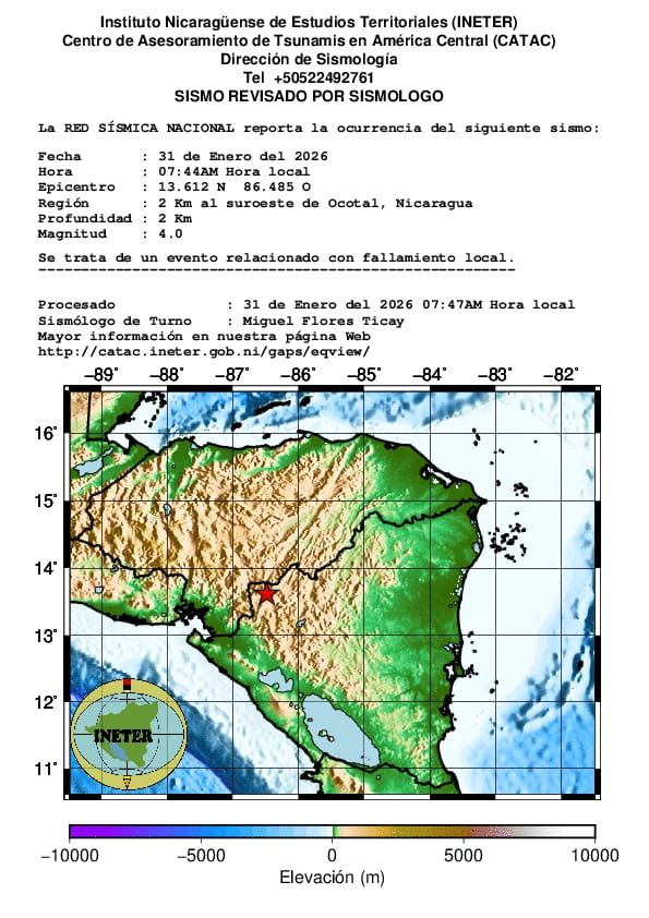 En un informe, detalló que el sismo de mayor intensidad ocurrió el este sábado 31 de enero a las 07:44 a. m., con una magnitud de 4, localizado a 2 kilómetros al Suroeste de Ocotal.