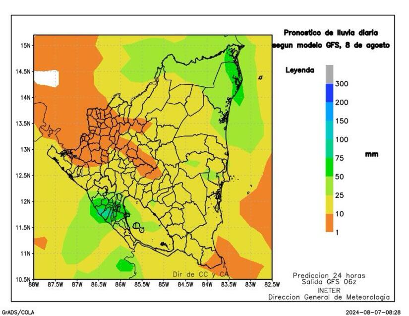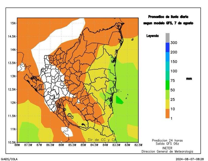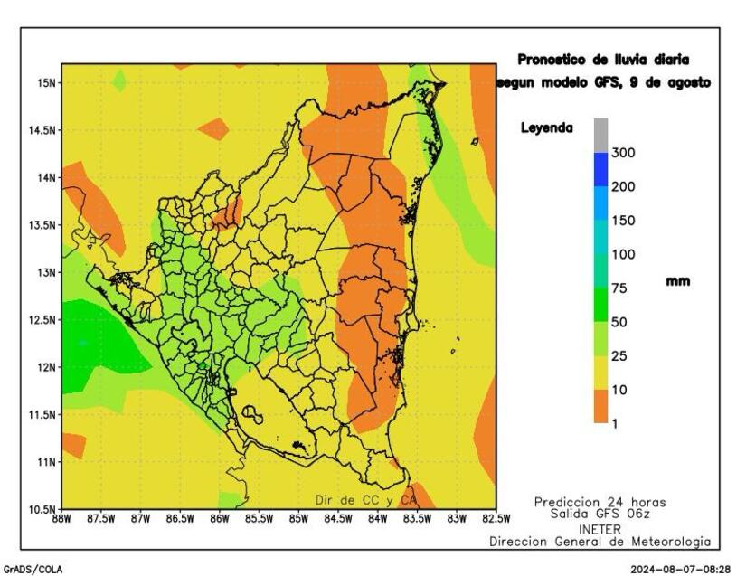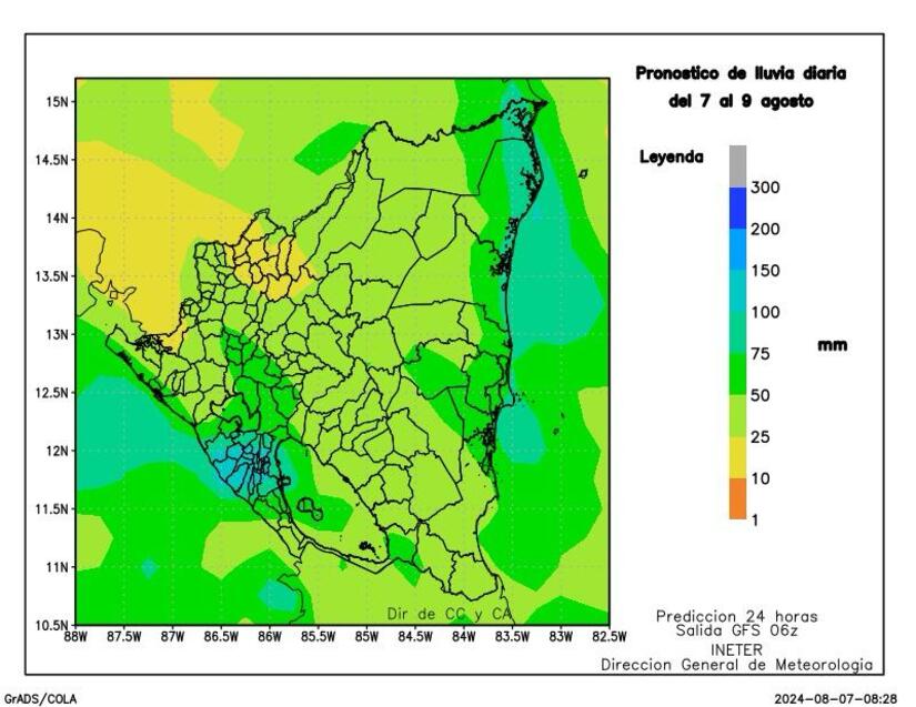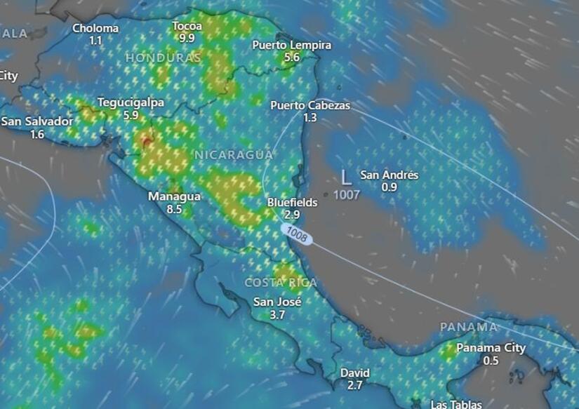 Igualmente se observan las áreas de bajas presiones frente a las zonas del Caribe de Nicaragua, las cuales se prevé que puedan alcanzar el territorio para el día de mañana jueves 8 de agosto.