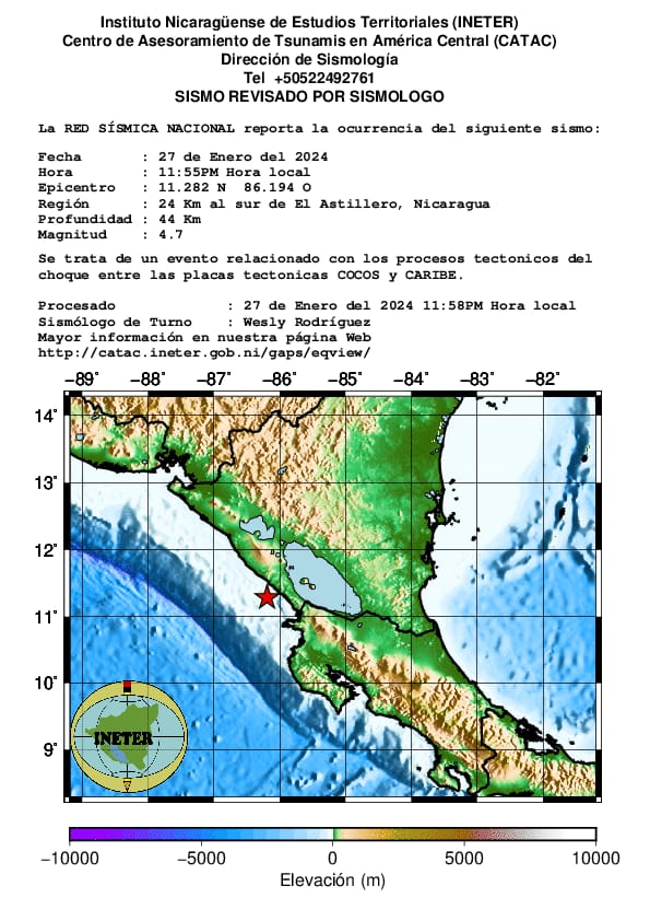 La Red Sísmica Nacional de Nicaragua reportó la ocurrencia de un sismo de magnitud 4.7, con epicentro a 24 km al sur de El Astillero, Rivas.