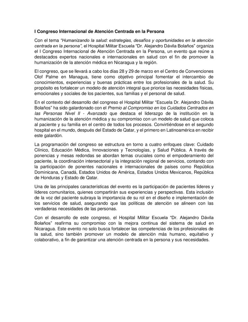 El Hospital Militar Escuela, Dr. Alejandro Dávila Bolaños anunció este jueves a través de una nota de prensa, la realización del I Congreso Internacional de Atención Centrada en la Persona, el cual inicia este viernes 28 y se concluirá este sábado 29 en el Centro de Convecciones Olof Palme.