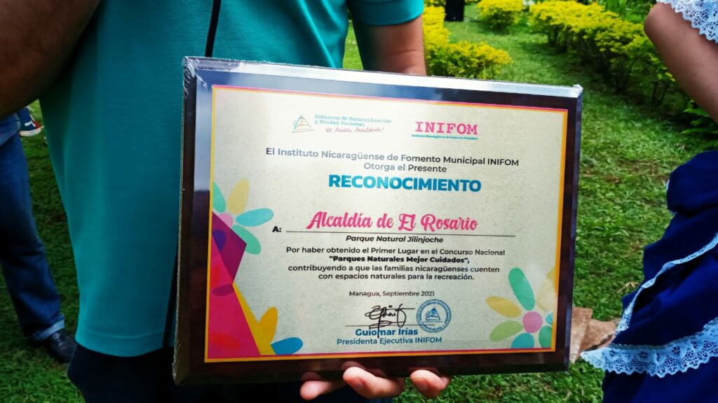Las autoridades de la Alcaldía de El Rosario recibieron a través del Instituto de Fomento Municipal (INIFOM), el galardón que declara al Parque Natural, como el mejor del departamento de Carazo.