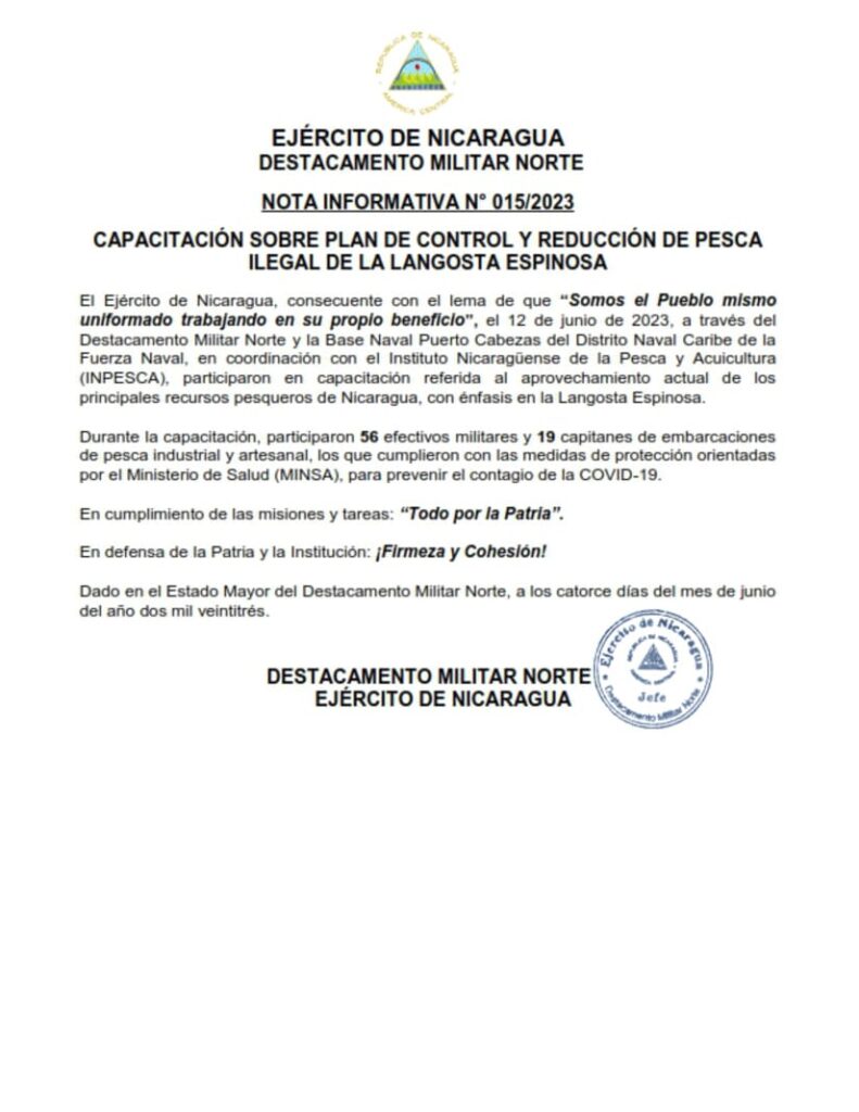 (Comunicado).- El Ejército de Nicaragua a través del Destacamento Militar Norte y la Base Naval Puerto Cabezas del Distrito Naval Caribe de la Fuerza Naval, en coordinación con el Instituto Nicaragüense de la Pesca y Acuicultura (INPESCA), participaron en capacitación referida al aprovechamiento actual de los principales recursos pesqueros de Nicaragua, con énfasis en la Langosta Espinosa.