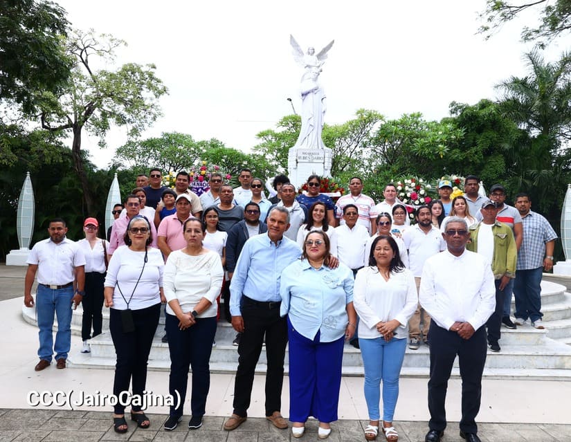 El Presidente de Nicaragua, Comandante Daniel Ortega y la Compañera Vicepresidenta Rosario Murillo, enviaron una ofrenda floral al monumento del Padre del Modernismo, Rubén Darío, ubicado en el Parque Central de Managua, en ocasión de celebrarse este 18 de enero, el 158 aniversario de su natalicio.