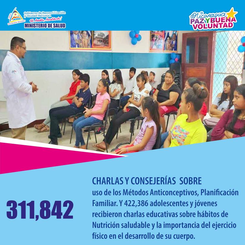 El Ministerio de Salud a través de la Campaña Nacional Juventud Divino Tesoro, ha realizado 311 mil 842 charlas y consejerías a adolescentes y jóvenes sobre el uso de los métodos anti-conceptivos y planificación familiar, informó el gobierno de Nicaragua en una nota de prensa.