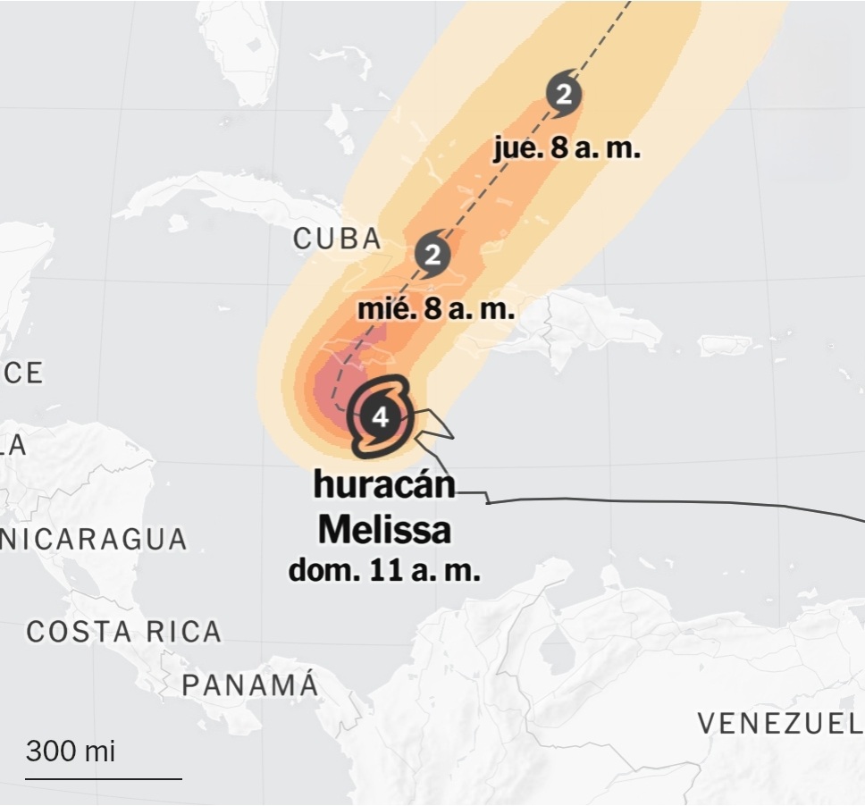 Se anticipa cierto debilitamiento a medida que Melissa pase por Jamaica, pero cuando llegue a Cuba y el sureste de las Bahamas, probablemente seguirá siendo un huracán de gran intensidad, señaló la entidad meteorológica.