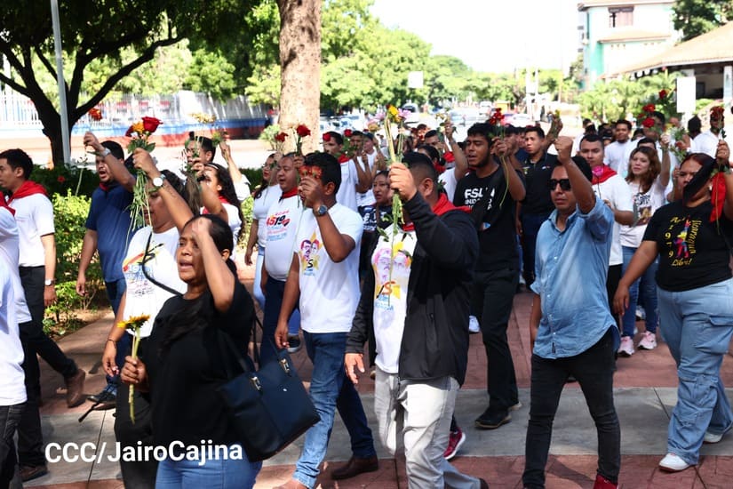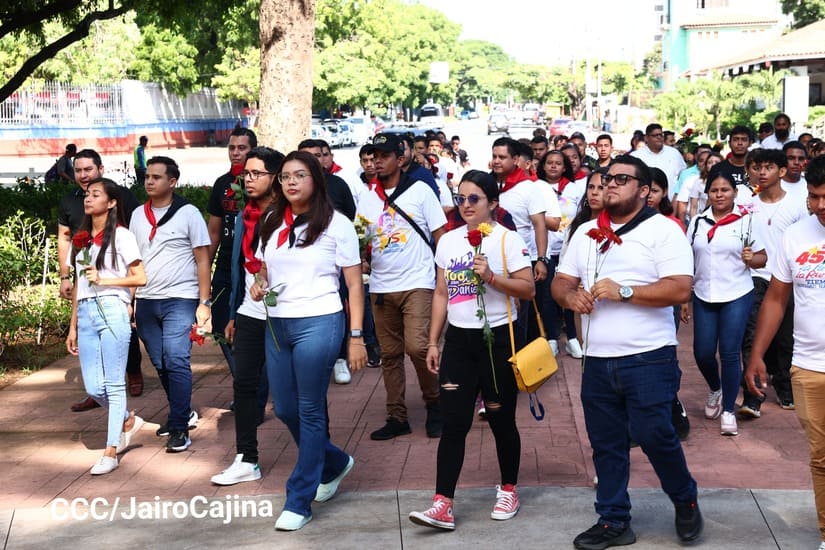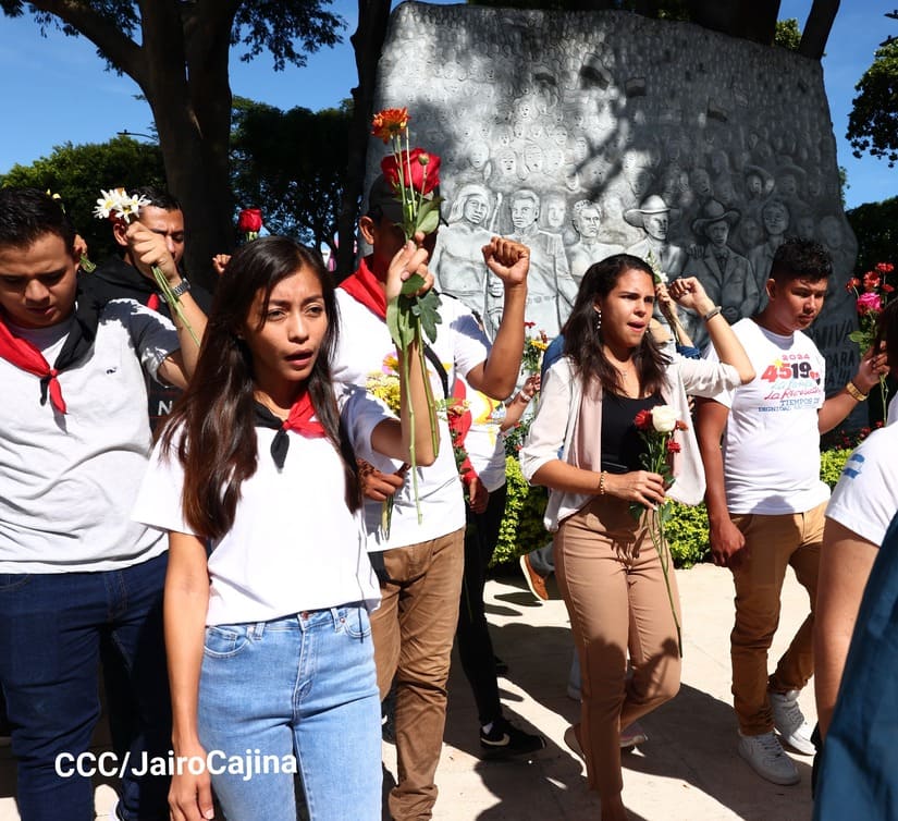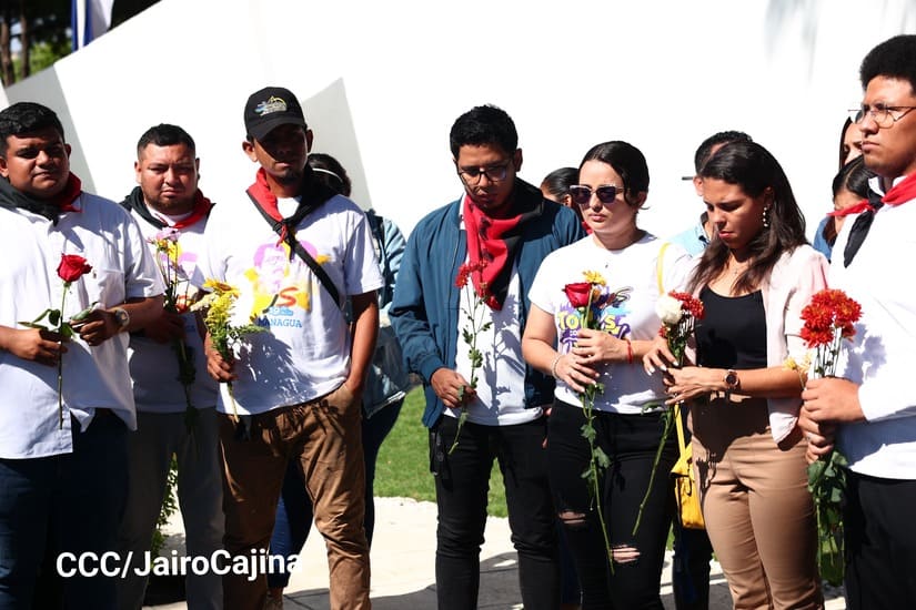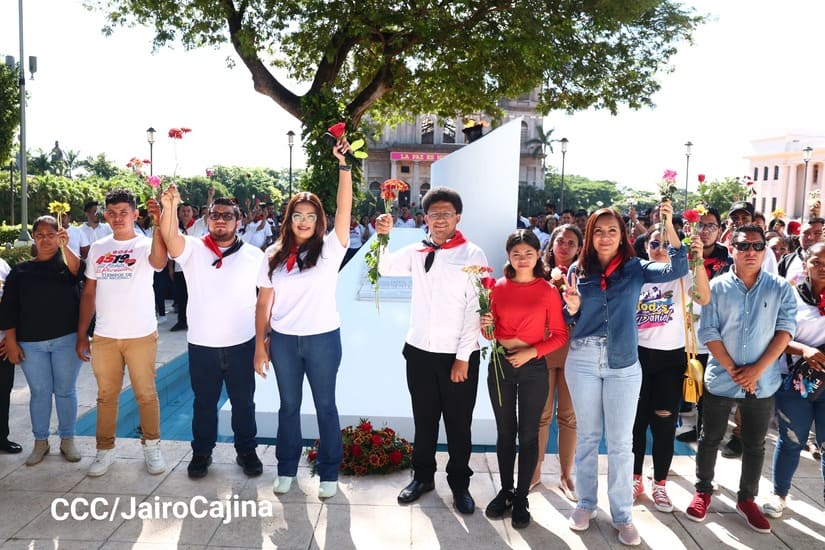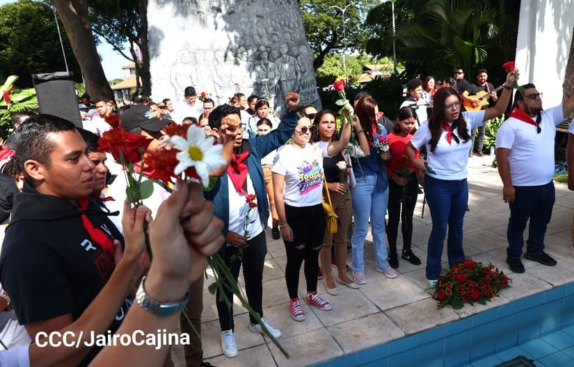 Con música revolucionaria, declamación de poemas y depósito de ofrendas florales, la Juventud Sandinista 19 de Julio se reunió en el parque Central, contiguo a la Plaza de la Revolución, para conmemorar el aniversario 98 y 94 de los natalicios del comandante en jefe Fidel Castro y del destacado revolucionario nicaragüense Tomás Borge, que se conmemoran este 13 de agosto.