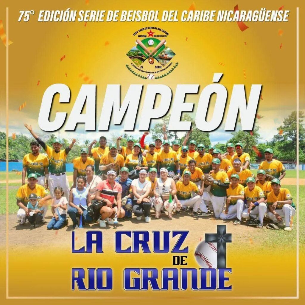 La Cruz de Río Grande escribió este domingo una página dorada en su historia deportiva al proclamarse campeón de la 75 Serie de Béisbol del Caribe Nicaragüense, disputada en Waspán, Caribe Norte, tras imponerse en la gran final 7-2 al conjunto de Bluefields.