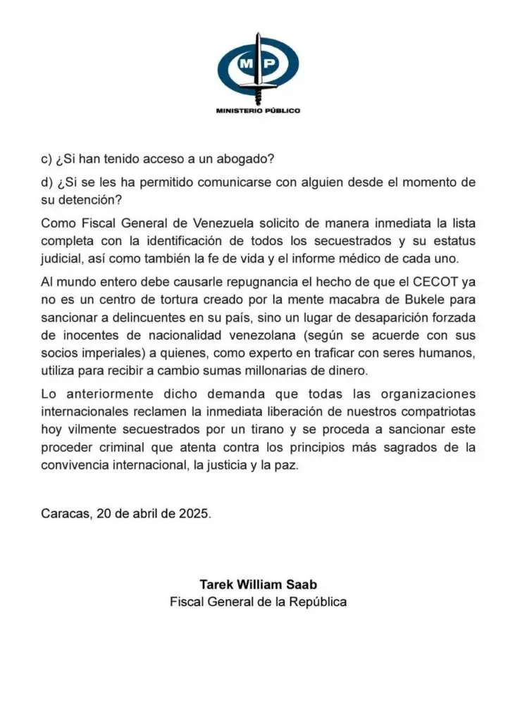 El fiscal venezolano reveló que envió comunicaciones oficiales a las autoridades judiciales de El Salvador exigiendo información sobre los cargos contra estos ciudadanos, sus derechos procesales y su estado de salud. También solicitó «la lista completa con la identificación de todos los detenidos y su estatus judicial, así como la fe de vida y el informe médico de cada uno de los secuestrados».