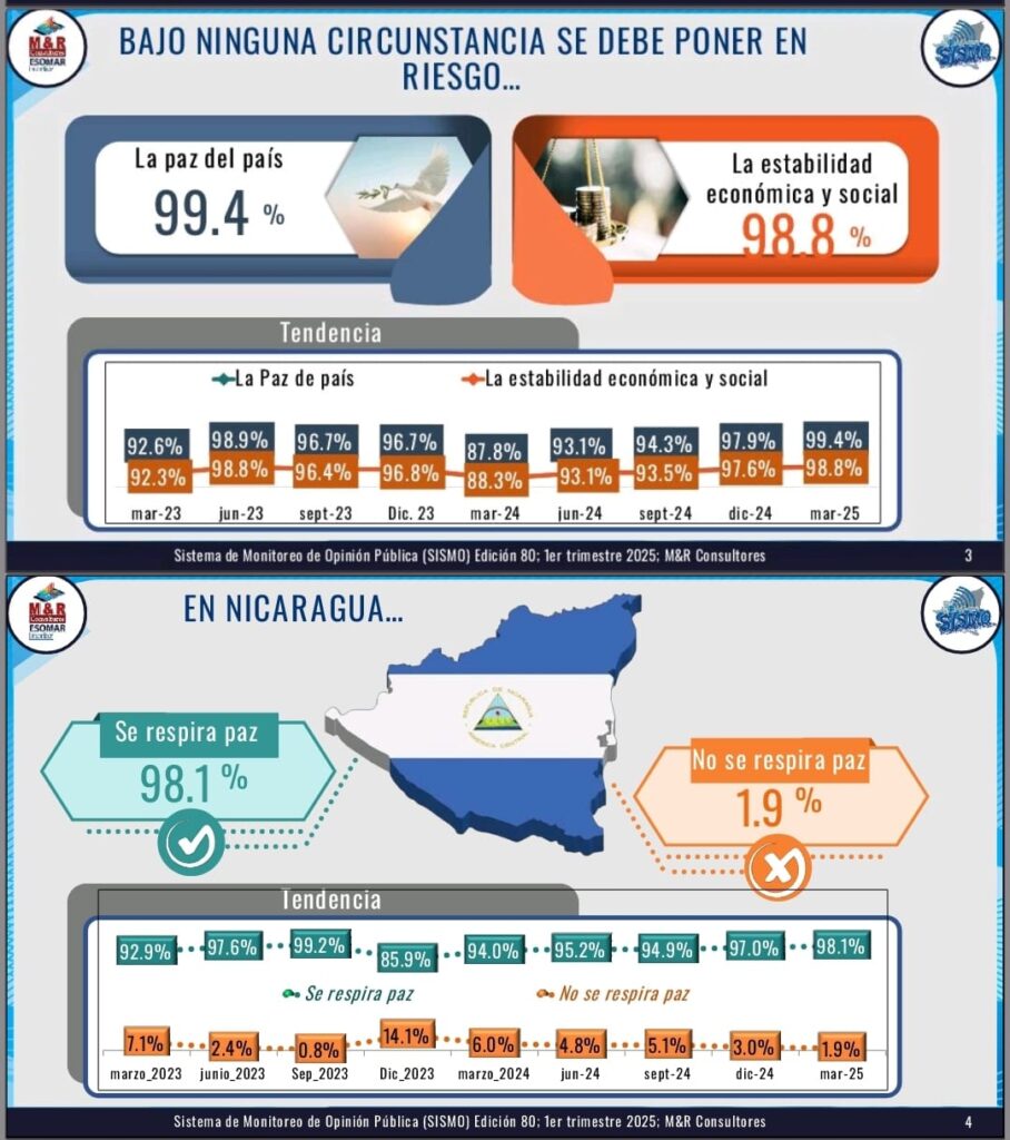 El 99.4% de los nicaragüenses opinaron que bajo ninguna circunstancia se puede poner en riesgo la paz en el país, mientras el 98.8% dijeron que tampoco se debe arriesgar la estabilidad económica y social; y un 98.1% que se respira paz en Nicaragua, así lo reveló el último estudio de M&R Consultores presentado este miércoles.