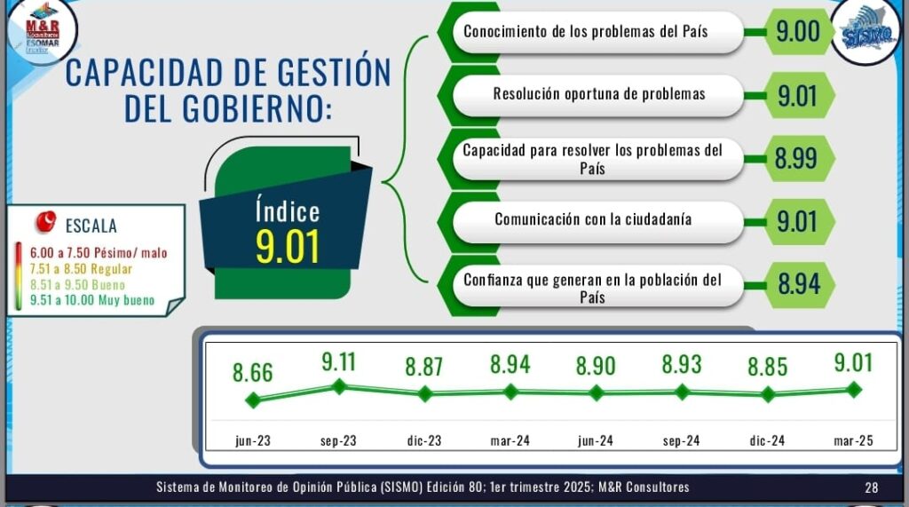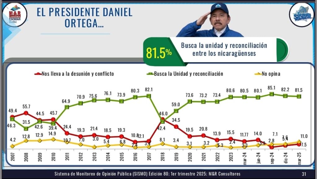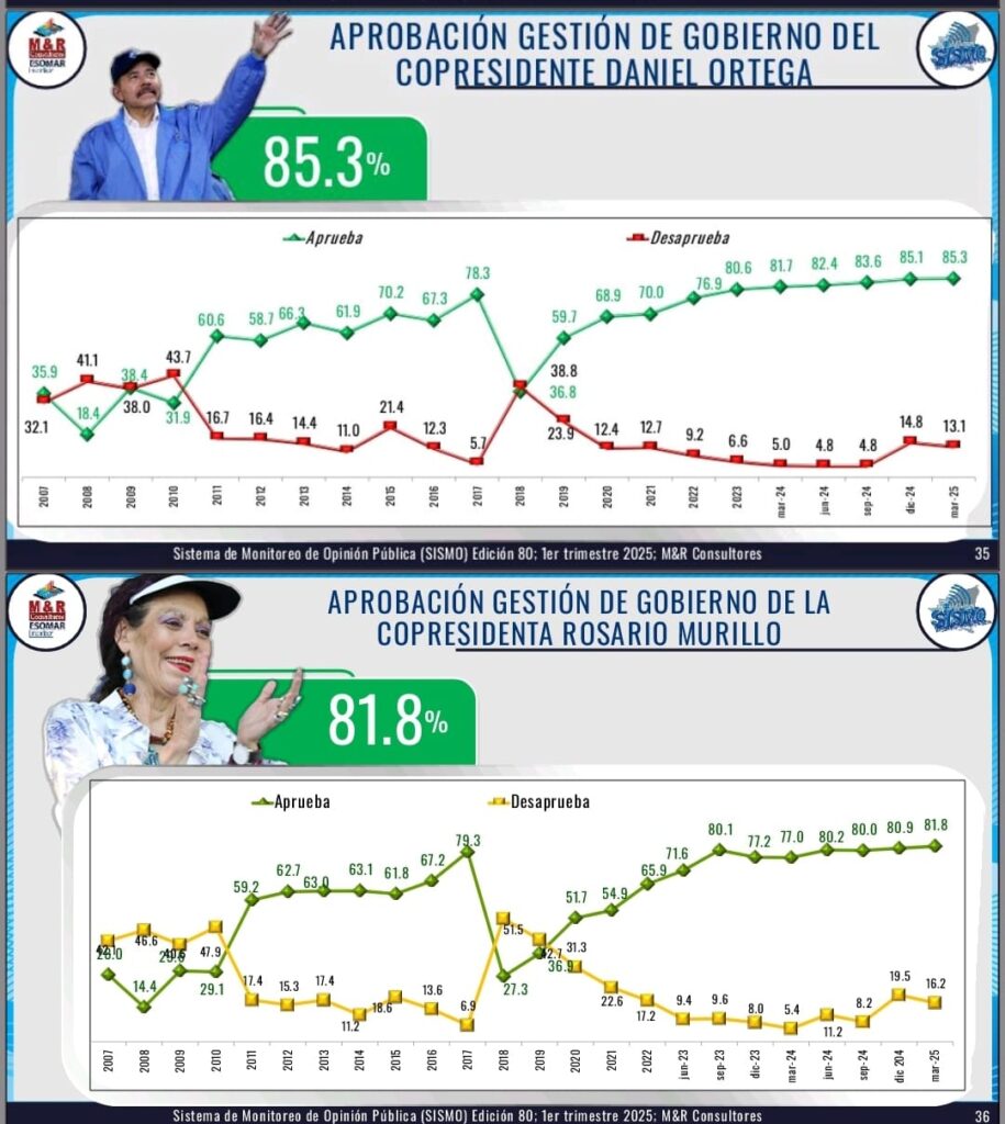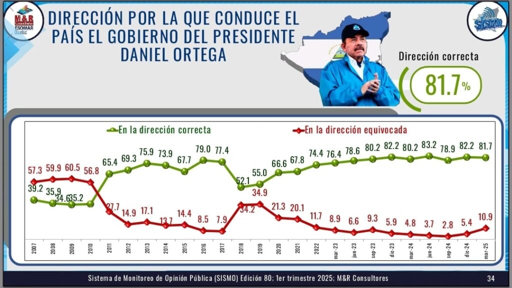 El funcionario del M&R Consultores, expuso además que el 81.7% de los encuestados afirmaron que el Comandante Ortega conduce el país por la vía correcta y que posee un 85.3% de aprobación en su gestión gubernamental.