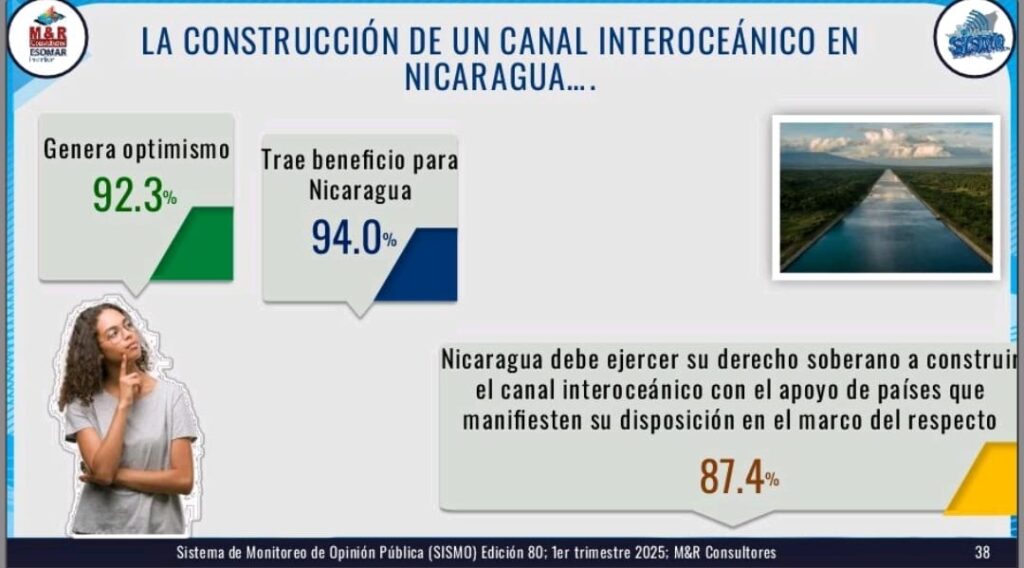 Respecto a la predisposición política, el 81.1% de los nicaragüenses se inclinó a favor del FSLN, mientras a la oposición solo en un 6.5%. Además, el 88.7% reconoce el grado de profesionalismo de la Policía Nacional y un 87.1%, adujo que la situación de seguridad ha mejorado en relación a hace 5 años. Otro aspecto considerado en el último estudio de M&R, dijo Obregón, es que el 93.4% de los ciudadanos reiteran su aprobación para la construcción del Canal Interoceánico