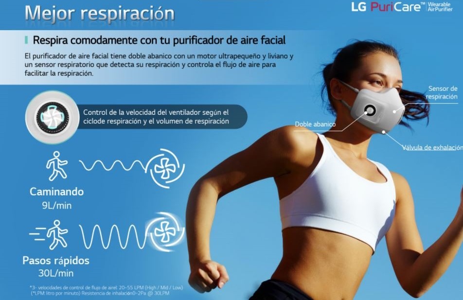 Una de las características principales de LG PuriCare es que cuenta con ventiladores dobles y sensor respiratorio patentado, además el purificador de aire facial permite a los usuarios tomar aire limpio y filtrado mientras el sensor respiratorio detecta el ciclo y el volumen de la respiración del usuario y ajusta los ventiladores duales de tres velocidades en consecuencia.