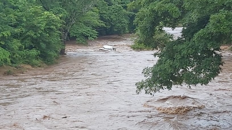 Durante el traslado de las familias, una camioneta Land Cruiser de la municipalidad fue arrastrada por las fuertes corrientes del Río Los Encuentros.