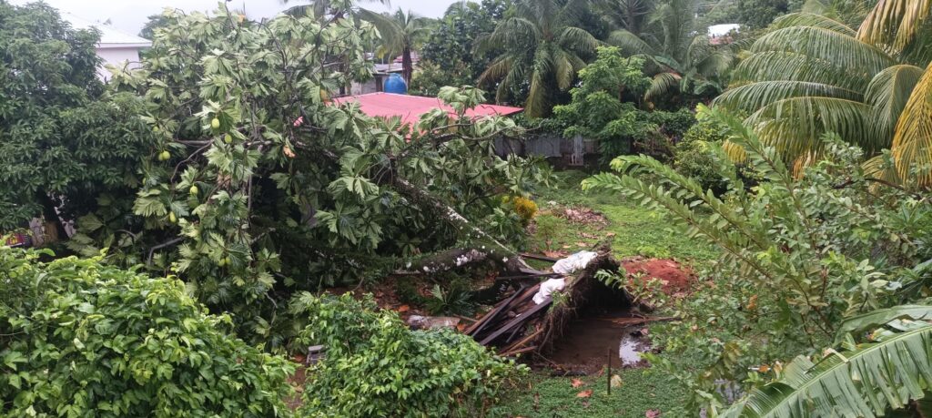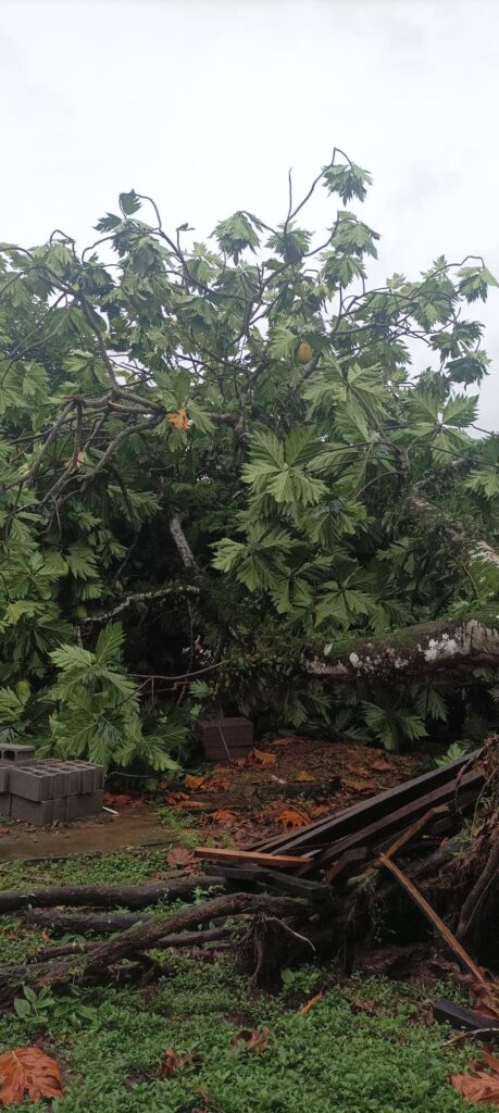 En el barrio Cotton Tree, en Punta Fría, se registró la caída de un gran árbol de fruta de pan, provocando daños en varias casas.