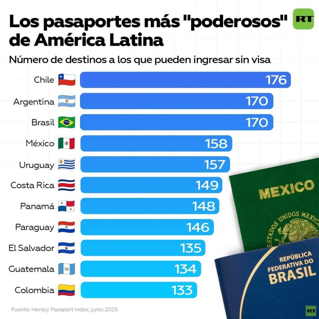 El índice incluye el análisis de 199 naciones y 227 destinos de viaje diferentes. Otros pasaportes de la región, como los de Costa Rica y el de Panamá, ocupan los lugares 27 y 28, permitiendo a sus nacionales tener acceso libre a 149 y 148 Estados, respectivamente. A su vez, Paraguay se localiza en la posición 30, con ingreso abierto a 146 países, mientras que Perú se sitúa en el puesto 32, con 143 países disponibles para entrar sin visado. Por su parte, el pasaporte salvadoreño se ubicó en el puesto 35 con 135 países disponibles.