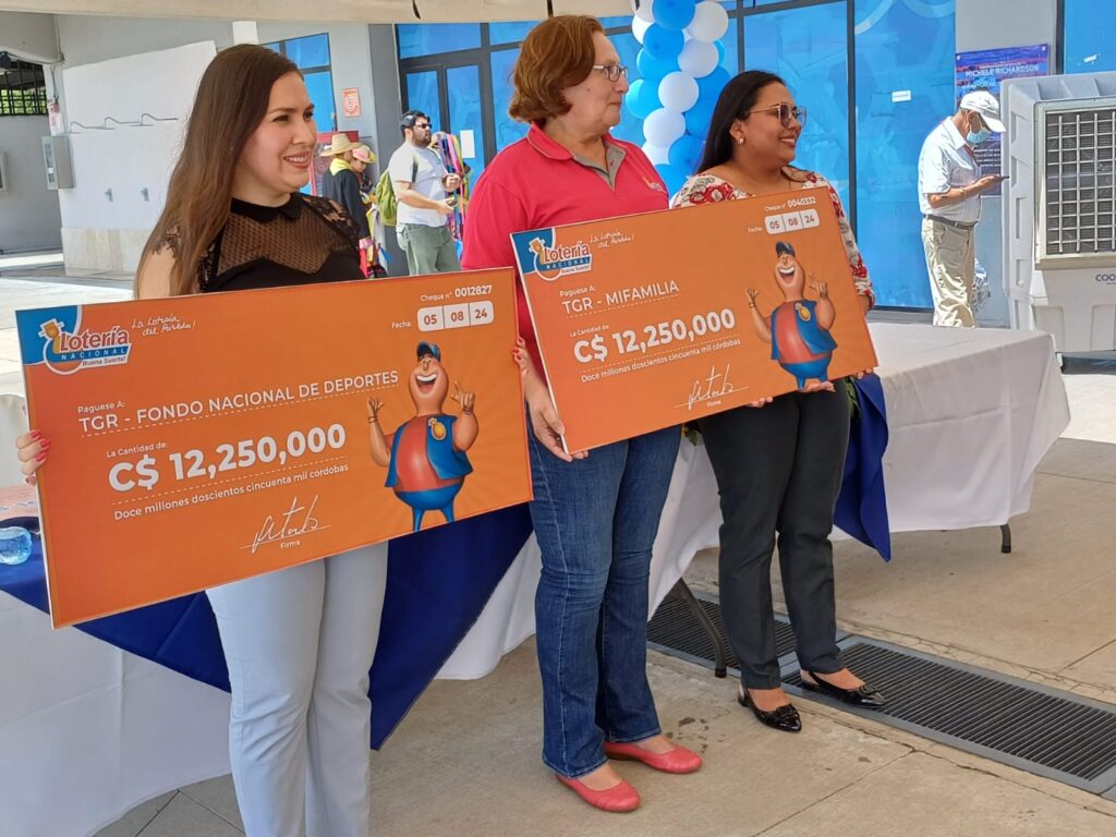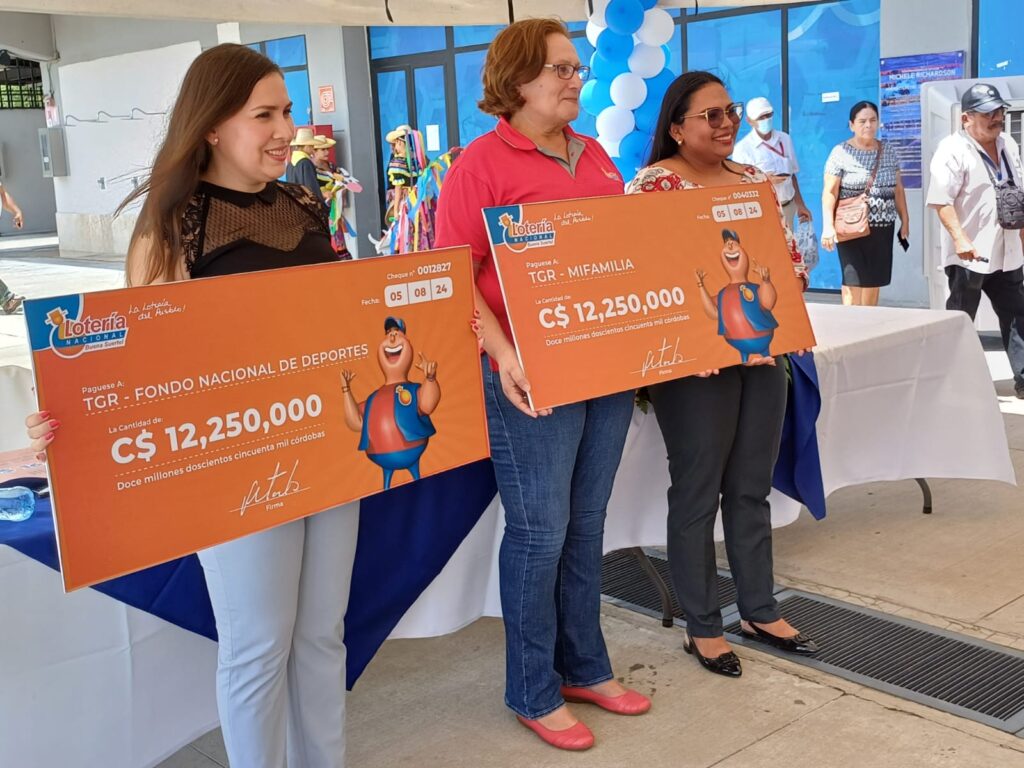 Con la entrega de 12 millones 250 mil córdobas de parte de la Lotería Nacional al Ministerio de la Familia Adolescencia y Niñez (MIFAN), y al Instituto Nicaragüense de Deportes (IND), se han otorgado C$196 millones en lo que va del 2024, informó este viernes la Gerente General de la entidad, Virginia Molina.