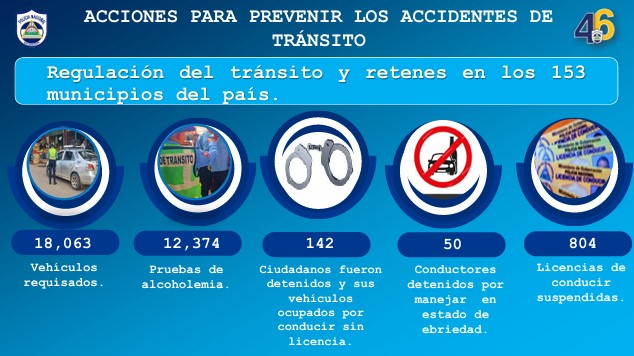Asimismo, detalló que dentro de las acciones para prevenir los accidentes de tránsito, la entidad brindó regulación del tránsito y retenes en los 153 municipios del país, requisaron 18 mil 63 vehículos, se realizaron 12 mil 374 pruebas de alcoholemia realizadas.