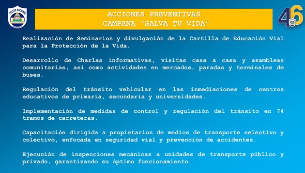 La comisionada Obando, detalló que dentro de las acciones preventivas de la Campaña Permanente Salva Tu Vida, se realizaron; seminarios y divulgación de la cartilla de educación vial para la protección de la vida, charlas informativas, visitas casa a casa y asambleas comunitarias, actividades en mercados, paradas y terminales de buses.