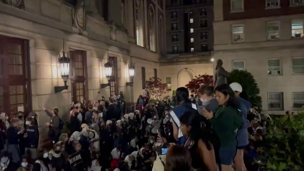 De acuerdo con el periódico universitario Columbia Spectator, después de que decenas de estudiantes irrumpieran en el edificio Hamilton Hall, cerraron las puertas y se atrincheraron utilizando mesas, sillas, barricadas metálicas y otros objetos. Uno de los manifestantes rompió con un martillo las ventanas de una puerta exterior y colocó lo que parece ser un candado de bicicleta alrededor de sus manillas.