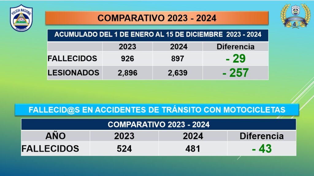 En lo referente a los accidentes de tránsito, el comisionado Vanegas detalló que durante este mismo periodo, 29 personas murieron sumando un total de 897 en lo que va del año.