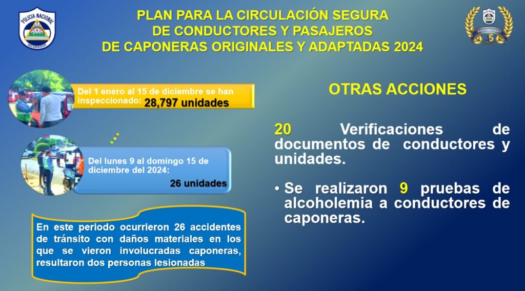Finalmente, como parte de los resultados del Plan de Emergencia Vial Campaña Salvá tu Vida, se impartieron seminarios a 22,956 protagonistas, se desarrollaron 7 mil 796 inspecciones mecánicas y se reguló el tránsito en 74 tramos de carreteras.