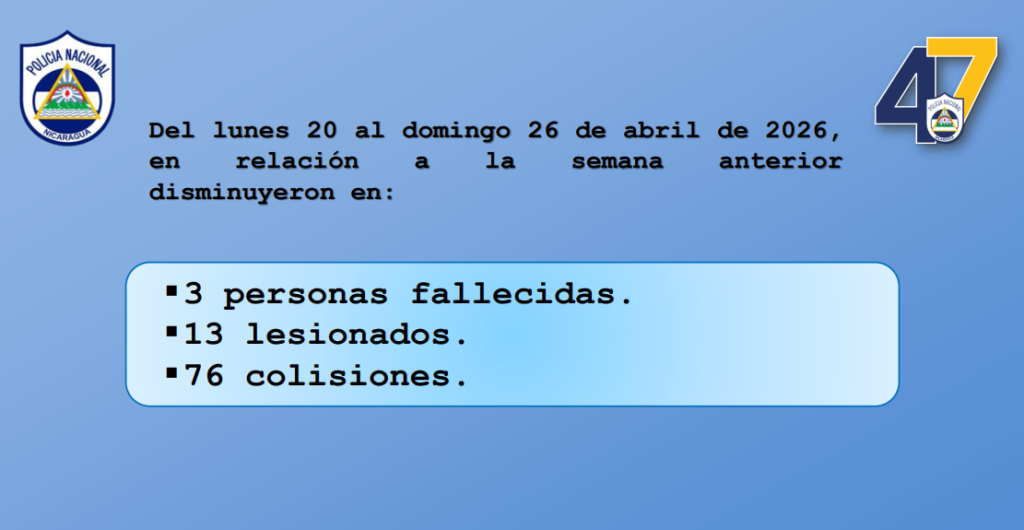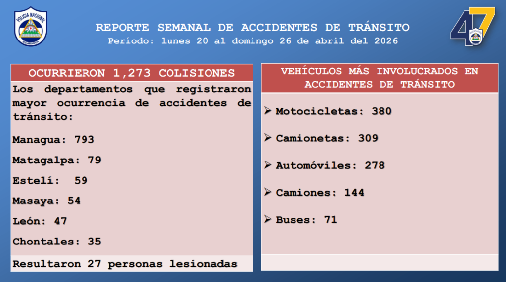 De acuerdo con el informe divulgado por la Cojefa de Relaciones Públicas de la Policía Nacional, comisionada Karen Obando, se registraron mil 273 colisiones que dejaron un saldo de 27 personas lesionadas. En comparación con la semana anterior, estas cifras representan una disminución de 3 personas fallecidas, 13 lesionados y 76 accidentes.