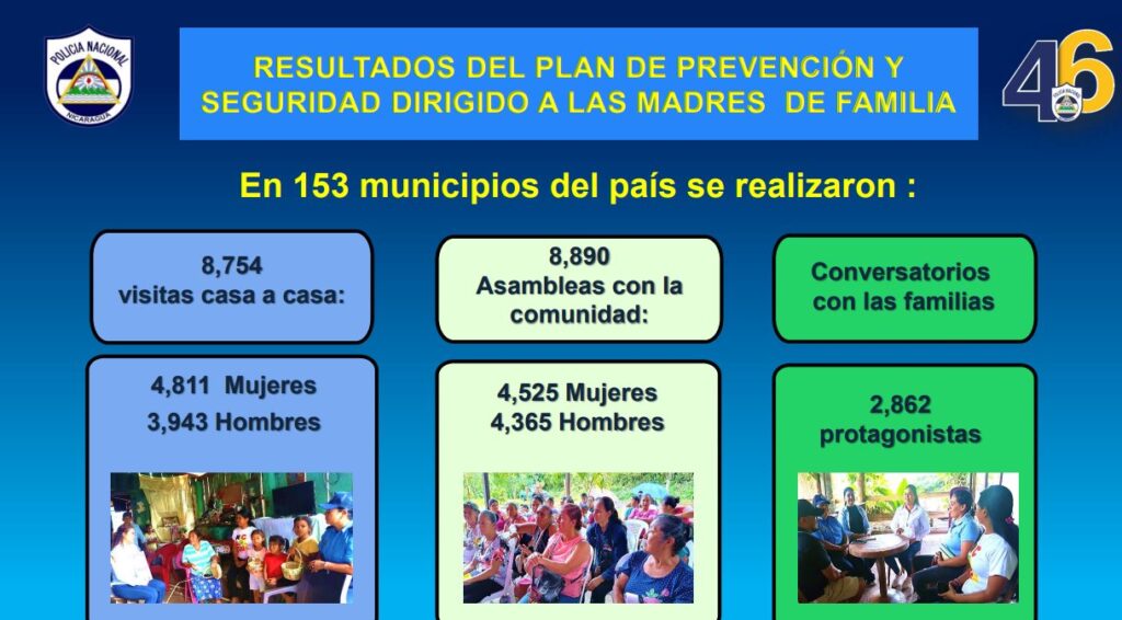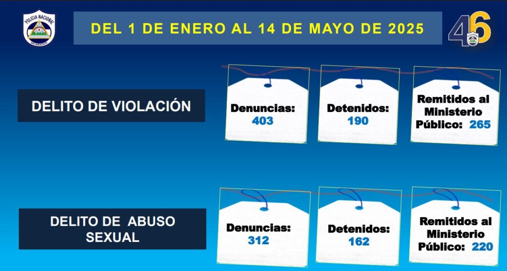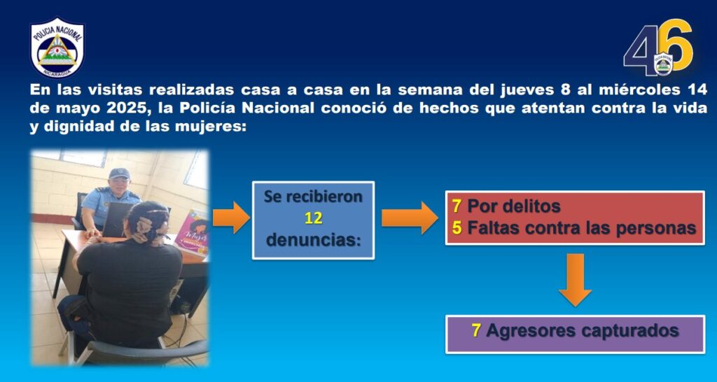 “En la semana del jueves 8 al miércoles 14 de mayo del 2025, la Policía Nacional conoció de hechos que atentan contra la vida y dignidad de las mujeres. Se recibieron 12 denuncias, siete por delito, cinco faltas contra las personas, siete agresores fueron capturados”, precisó la jefa policial.