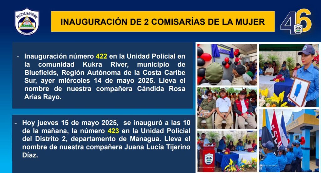 “Inauguración número 422 en la unidad policial de la comunidad de Kukra River, municipio de Bluefields, Región Autónoma de la Costa Caribe Sur, lleva el nombre de nuestra compañera Cándida Rosa Arias Rayo. Hoy jueves 15 de mayo del 2025 se inauguró la número 423 en la unidad policial del Distrito II, departamento de Managua con el nombre de nuestra compañera Juana Lucía Tijerino Díaz”, precisó la subcomisionada Obando.