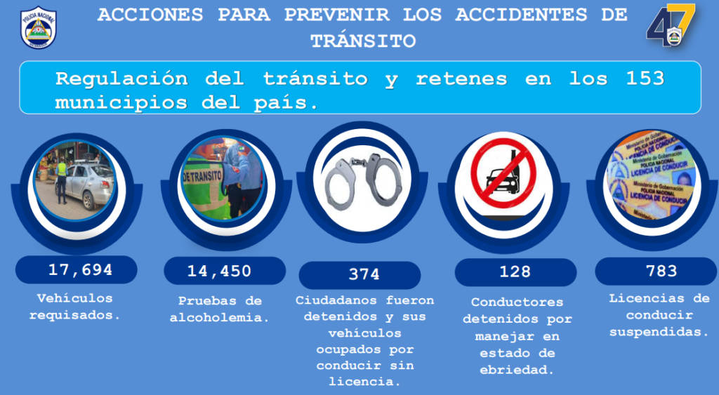 Al menos 128 personas fueron detenidas por la Policía Nacional en el período del 6 al 12 de abril, por conducir en estado de ebriedad, además de 374 por conducir sin licencia, mientras que suspendieron 783 licencias.