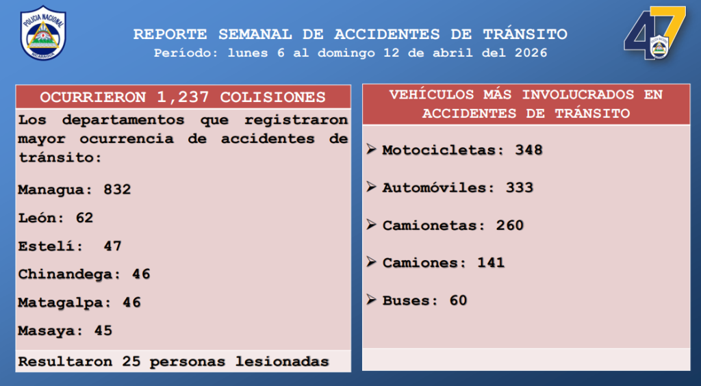 La Cojefa de Relaciones Públicas de la entidad policial, comisionada Karen Obando, detalló que en el mismo período ocurrieron mil 237 colisiones, registrándose una disminución de 7 fallecidos y 28 lesionados en comparación con la semana anterior.