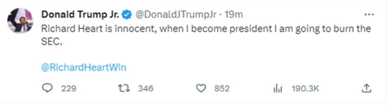 “Richard Heart es inocente”, lanzó, en referencia al youtuber e influencer del sector de criptomonedas y aseguró que iba a “quemar la SEC”, el organismo regulador de la Bolsa de Estados Unidos por la denuncia que hizo contra Heart.