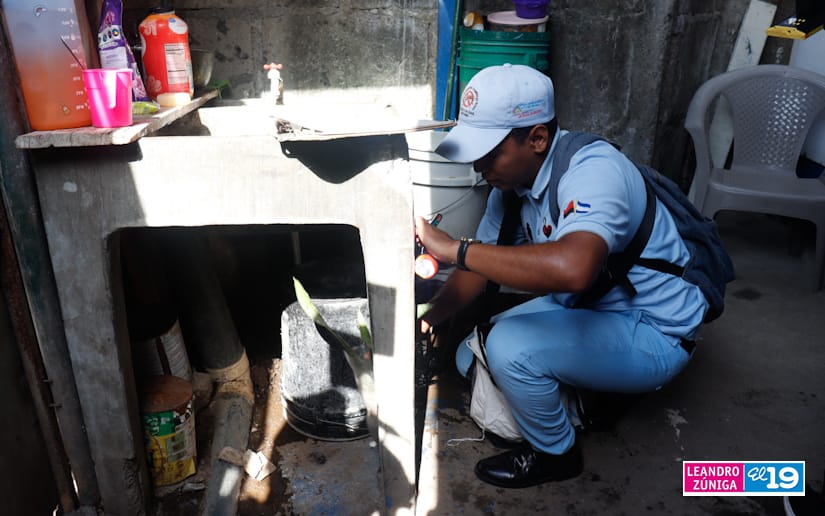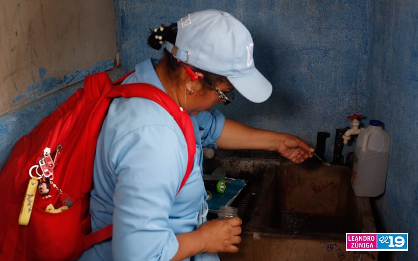 Una brigada antiepidémica del Centro de Salud Francisco Buitrago, ubicado en el Distrito IV, de Managua, realizó este lunes la aplicación de abate (un larvicida para el control del mosquito Aedes aegypti), en los recipientes donde se almacena agua potable, en el barrio Benedicto Valverde.