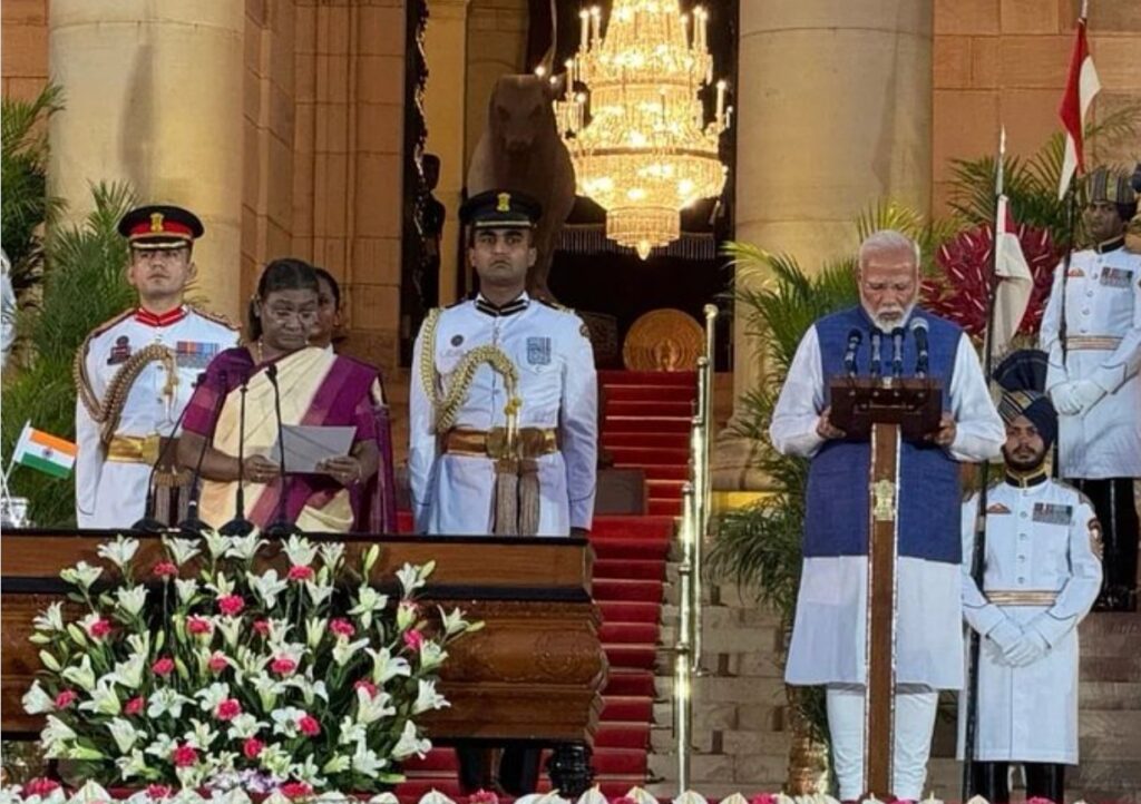 La ceremonia de investidura de Modi ante la presidenta del país, Draupadi Murmu, fue transmitida en directo por las cadenas de televisión locales. El líder del Partido Popular indio (Bharatiya Janata) se convierte en la segunda persona que asume por tercera vez el cargo de jefe de gobierno del país, después de Jawaharlal Nehru.