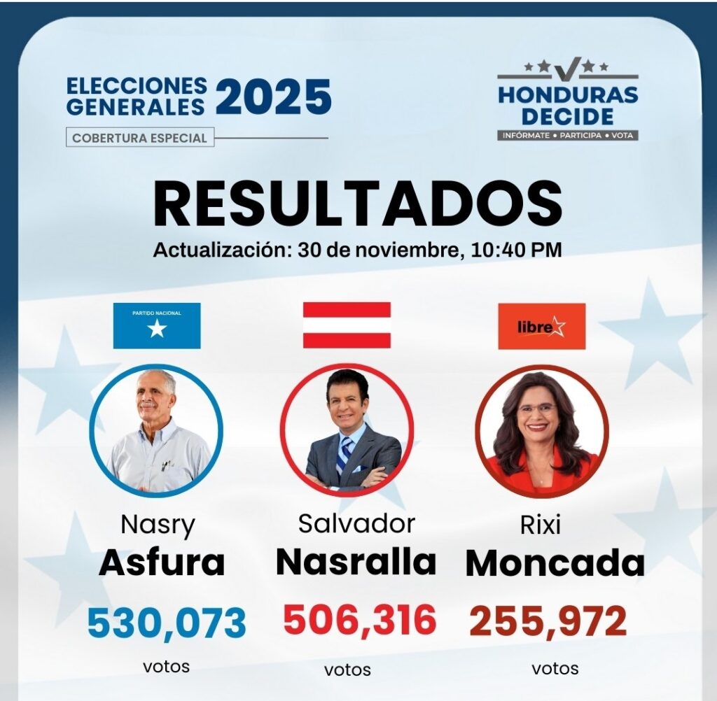 Con un 34.25 % de actas divulgadas, Asfura, el derechista respaldado por Trump y Milei, obtuvo el 40.64%, seguido por el centrista Salvador Nasralla con 38.76%, mientras la candidata Rixi Moncada, queda tercera con el 19.6% y Mario Enrique Rivera, en el cuarto lugar.