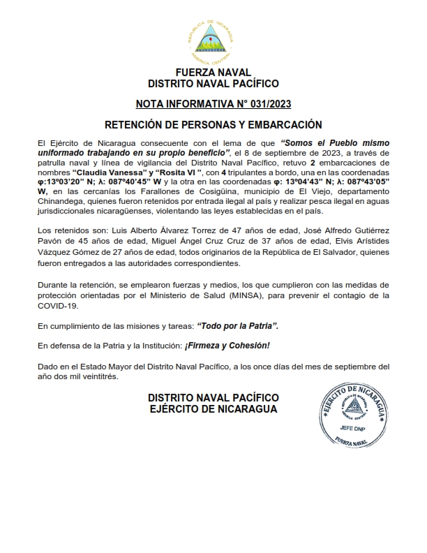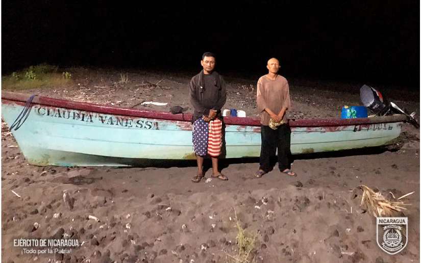 (Comunicado).- El Ejército de Nicaragua consecuente a través de patrulla naval y línea de vigilancia del Distrito Naval Pacífico, retuvo 2 embarcaciones de nombres “Claudia Vanessa” y “Rosita VI ”, con 4 tripulantes a bordo,  en las cercanías los Farallones de Cosigüina, municipio de El Viejo, departamento Chinandega, quienes fueron retenidos por entrada ilegal al país y realizar pesca ilegal en aguas jurisdiccionales nicaragüenses, violentando las leyes establecidas en el país.