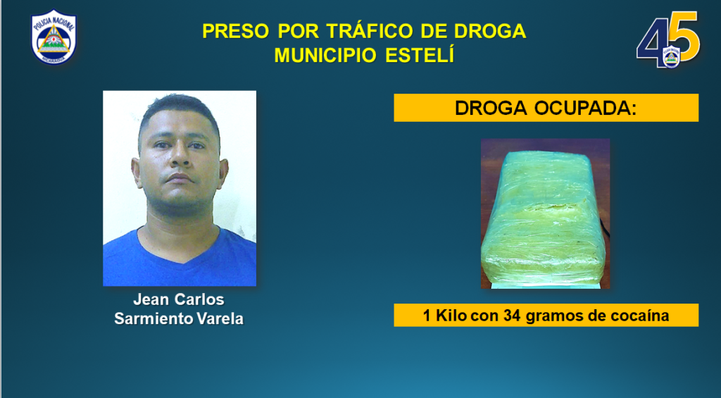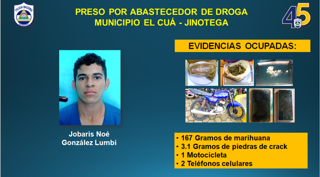 Mientras tanto, a los detenidos por abastecimiento y tráfico de drogas en Estelí y Jinotega, se les ocupó un kilo con 34 gramos de cocaína, 167 gramos de marihuana, 3.1 gramos de piedras de crack, una motocicleta y dos teléfonos celulares.