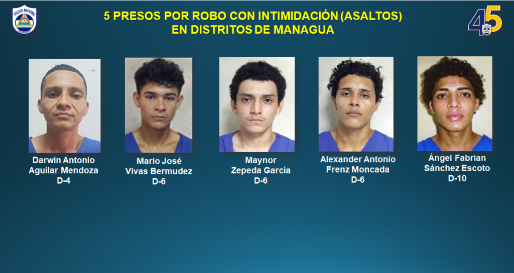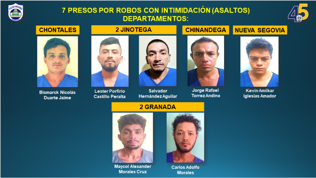 En cuanto a los asaltantes tres corresponden al Distrito IV, uno del Distrito IV y uno del Distrito X de Managua. Mientras tanto, dos corresponden al municipio de Jinotega, dos a Granada, uno a Chontales, Chinandega y Nueva Segovia.