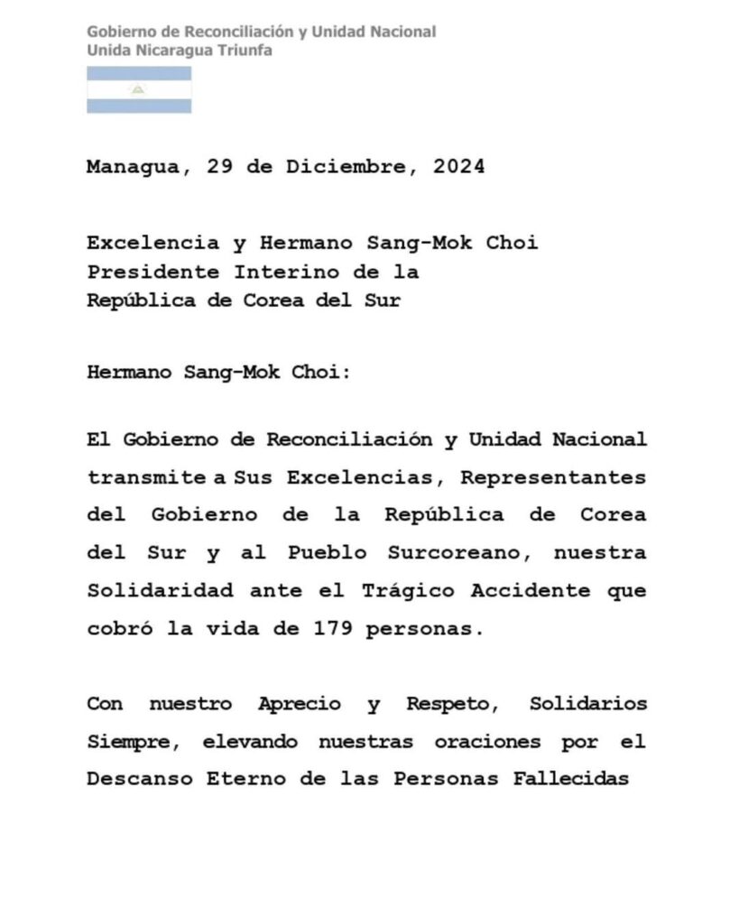 El Gobierno de Reconciliación y Unidad Nacional transmite a Sus Excelencias, representantes del Gobierno de la República de Corea del Sur y al pueblo surcoreano, nuestra solidaridad ante el trágico accidente que cobró la vida de 179 personas.