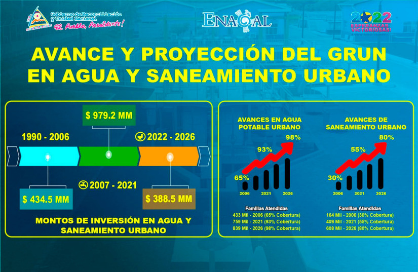 El Presidente Ejecutivo de la Empresa de Acueductos y Alcantarillados Sanitarios (ENACAL), Ervin Barreda, informó que el Gobierno de Nicaragua, pretende alcanzar una cobertura de agua potable del 98% para el año 2026. En lo que va del 2022, es del 95% gracias a los proyectos emblemáticos de potabilización.