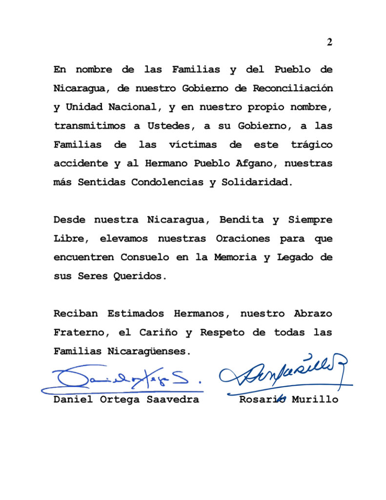 El gobierno de Nicaragua a través de un comunicado enviado al Primer Ministro de Afganistán expresó su solidaridad ante la muerte de 71 personas tras incendiarse un autobús en la ciudad de Herat.