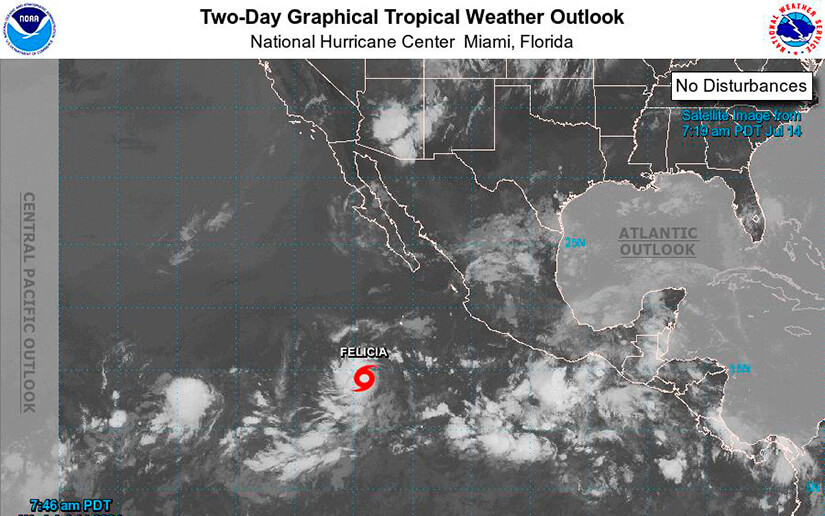 3.- Se formó la Tormenta Tropical “FELICIA”, a partir de un Disturbio Atmosférico, se localiza su centro a nos 1055 km al Sur / Sur-Oeste del a Península de Baja California; se desplaza con rumbo Oeste / Sur-Oeste, alejándose de la Costa de México.