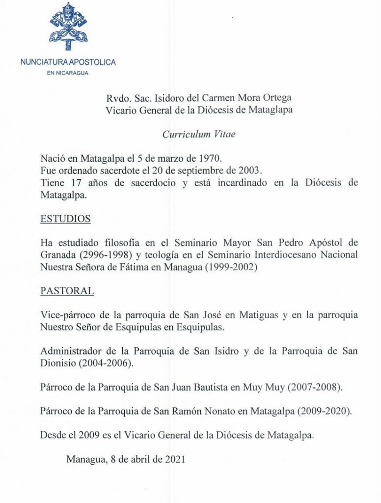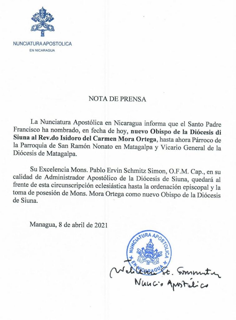 El papa Francisco nombró este 8 de abril a monseñor Isidoro del Carmen Mora Ortega como el nuevo obispo de la Diócesis de Siuna, cargo que estaba vacante desde hace más de un año tras la muerte del obispo David Albin Zywiec.