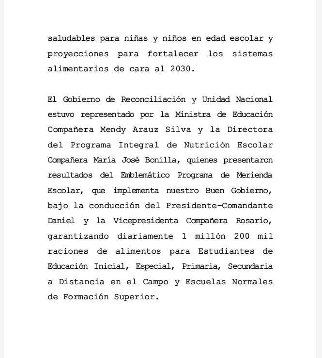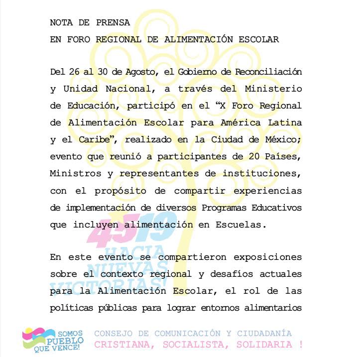 A través de nota de prensa el Gobierno de Reconciliación y Unidad Nacional informó este sábado sobre su participación en el foro regional sobre la alimentación desarrollado en México.